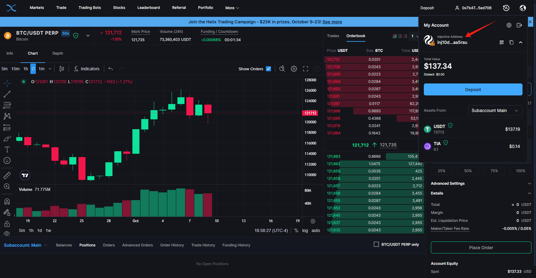 Follow the instructions and continue the steps, once the transfer is completed, you can check the USDT balance in your Injective Wallet or the Balances page on Helix. Swap INJ to USDT by using the Swap feature if needed, and then you are all set to trade!