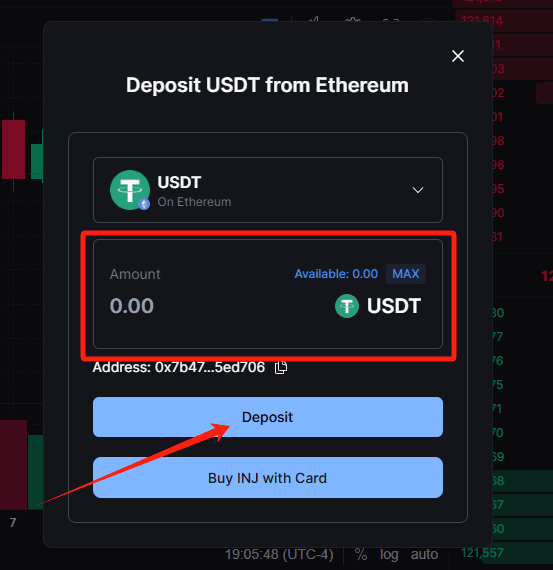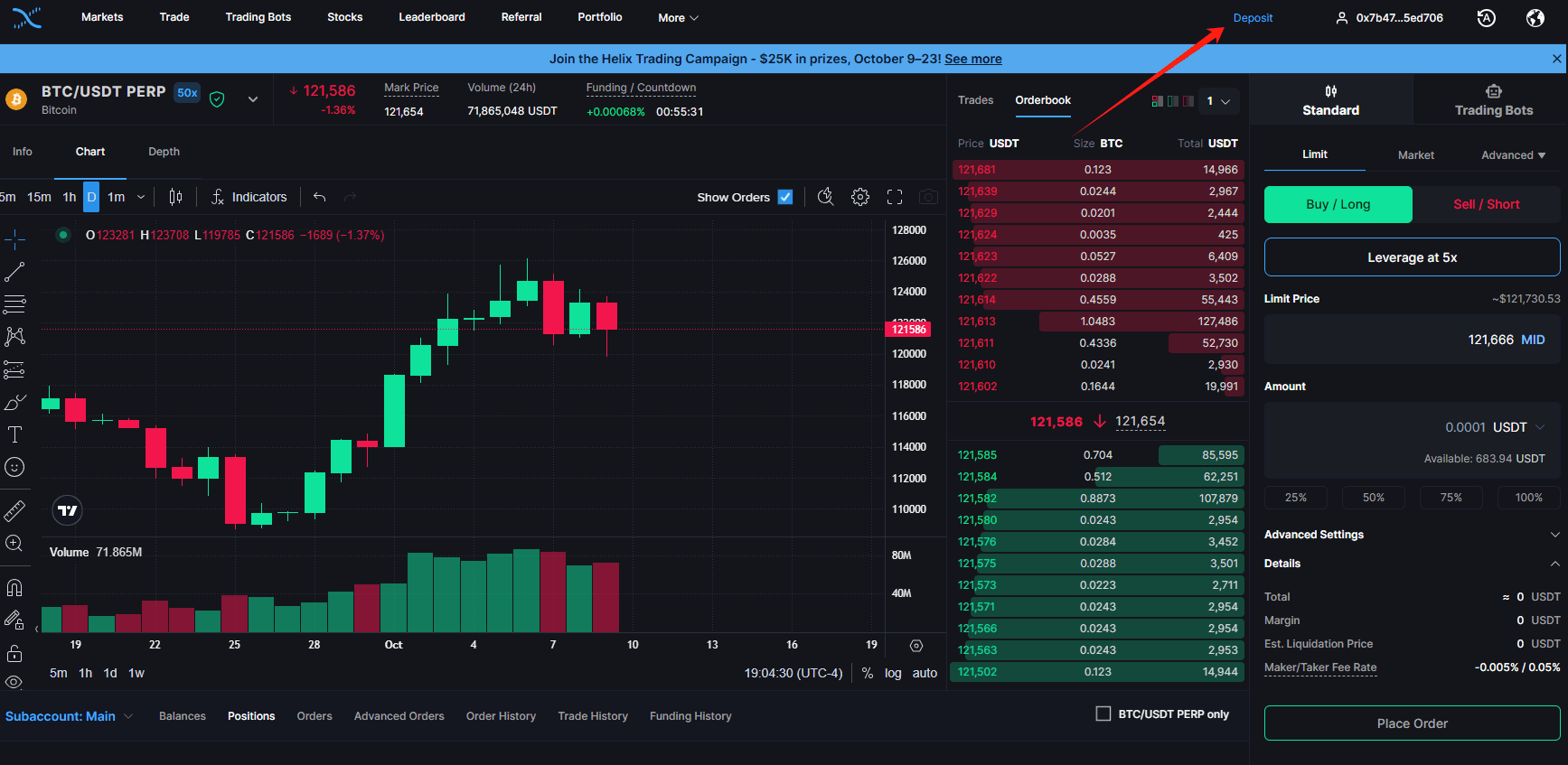 To place trades on any of the market listings on Helix, you will need to deposit funds into your Injective wallet. To deposit funds, click the “Deposit” button on the top right corner.