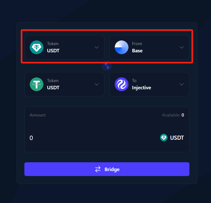 To bridge assets to Helix, first visit Injective bridge and connect your wallet. Select the network from the dropdown menu as the origin source (eg. Base). Select “USDT” as the asset to transfer and make sure it has USDT balance; Enter the amount of USDT tokens you would like to transfer and click “Bridge” and “Confirm”.