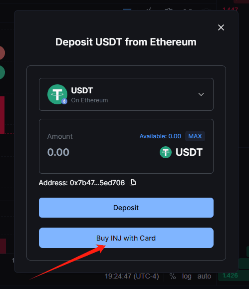 Go to deposit and click buy INJ with Card, select your currency and enter the amount you would like to buy. Choose your payment type and click Buy INJ.